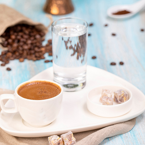 Damla sakızlı Türk kahvesi, küp şeker, lokum, su