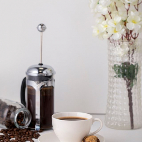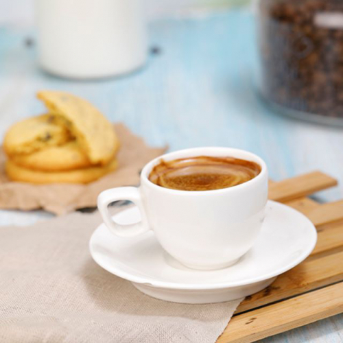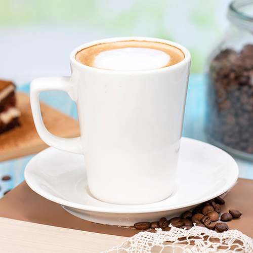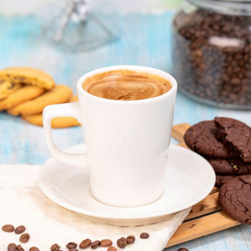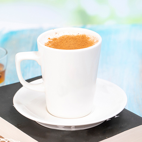 Çekirdek kahve, süt, süt köpüğü, kuru pasta. Glüte...